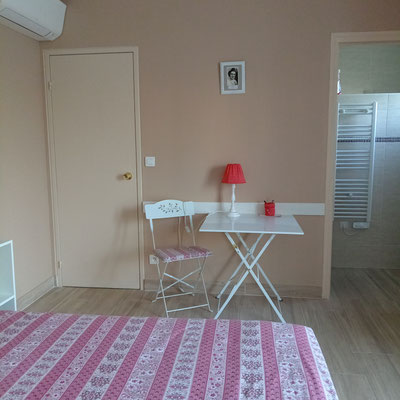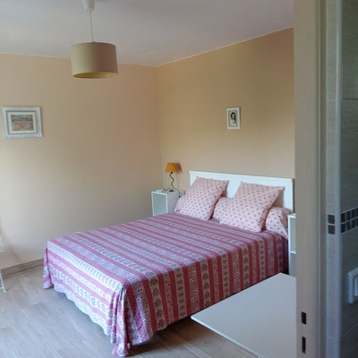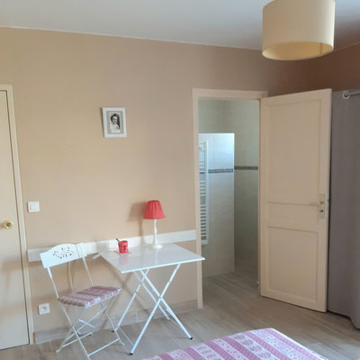 Une suite (20m²) pour une à deux personnes, face à la piscine, composée d'une chambre (lit en 160) avec dressing, table, chaises et d'une salle d'eau (douche à l'italienne) avec toilettes.